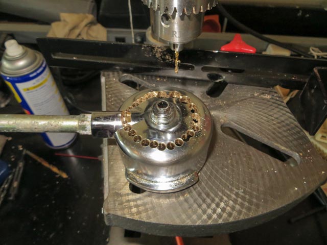 To make this simpler / faster you can make a jig out of a piece of wood and a bolt though the spigot hole – this will allow you to drill, rotate, drill rotate and get all of the holes nicely lined up. I didn’t do this, but really should have!