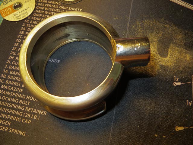 Now place the portafilter (without the metal handle!) on a lathe and machine away the excess material. I used a Central Machinery 7″ X 10″ Precision Mini Lathe. Something larger / more powerful would have made the process faster, but this worked ok. Running some fine sandpaper (on a dowel or similar) around the machined edge (while turning on the lathe) makes short work of tidying up the sharp edges, removing burrs and polishing the work.